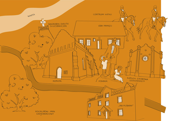 Witaj w Jaszkowie, w gminie Brodnica, jest tu zielona, piękna okolica. Leżąca na terenie Rogalińskiego Parku Krajobrazowego, znana z rzeki Warty, licznych starorzeczy i ptactwa wodnego. Wieś znana od XII w. za sprawą rycerskiego rodu, choć nie była miejscem znaczącego grodu. Rządzili tu Borkowie i Jaszkowscy, a później Lwowscy no i Szołdrscy. Na kartach historii Chwalimir się zapisał, bo katedrze poznańskiej majątek przepisał, a było to w drodze testamentu w wieku trzynastym, co potwierdził książę Przemysł II podpisem własnym. Miejsce to rozsławił Edmund Bojanowski, który miał na życie niezwykły plan boski. Na gruncie przez ród Szołdrskich ofiarowanym do budowy ochronek został powołany. Czas już rozpocząć wędrówkę po Jaszkowie. Stosuj się do wskazówek, które Edmund Ci podpowie. Ruszaj przez furtkę na teren kościoła, tam już Bojanowski z pomnika Cię woła. Postacie całe z brązu misternie odlane we wsi Szymanowo zostały wykonane. Odczytaj litery z dziewczęcia książeczki i wpisz w puste hasła krateczki. Edmund Bojanowski jest rozsławiony, bo w 1999 roku został błogosławiony. Zakładał ochronki, czytelnie ludowe, w młodzieży i dzieciach widział kraju odnowę.