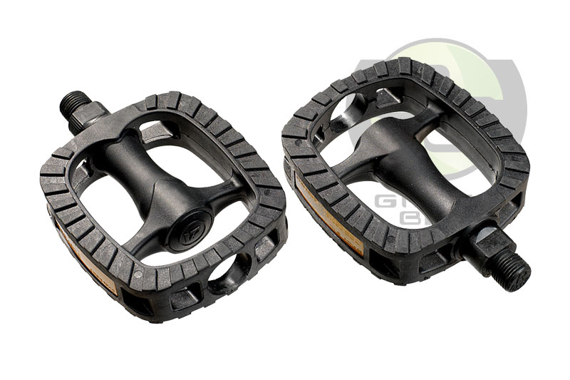 Plastikowy pedał MTB/CROSS/TREKKING. Korpus: plastikowy z gumą antypoślizgową. Oś: stalowa. Łożysko: kulkowe. Rozmiary: 106 x 84,5 mm. Waga: 320g.