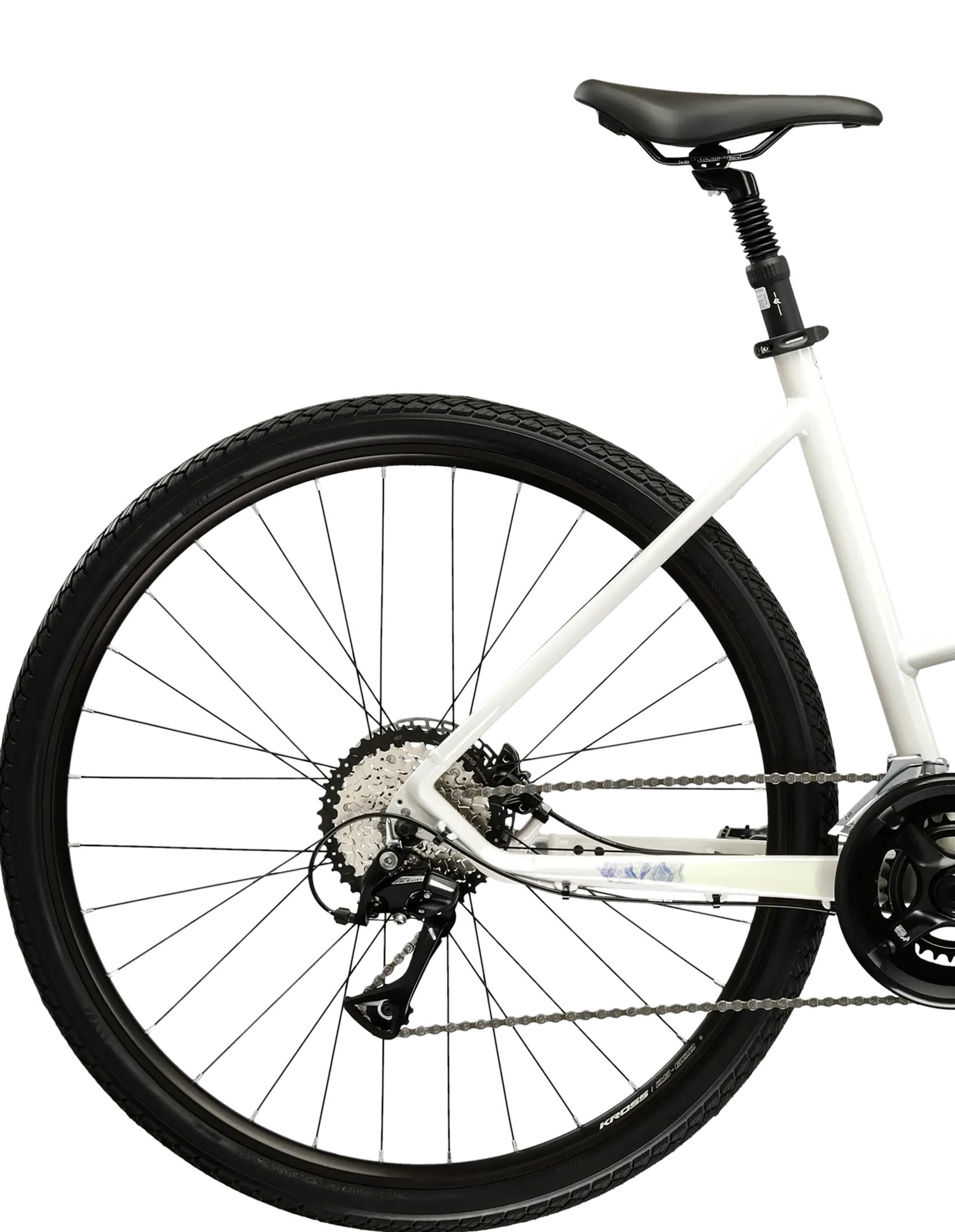 • Napęd Shimano 2x8: Dwurzędowa korba Shimano TY501 w połączeniu z 8-rzędową kasetą upraszcza obsługę i redukuje masę roweru, zachowując szeroki zakres biegów na każdy teren.