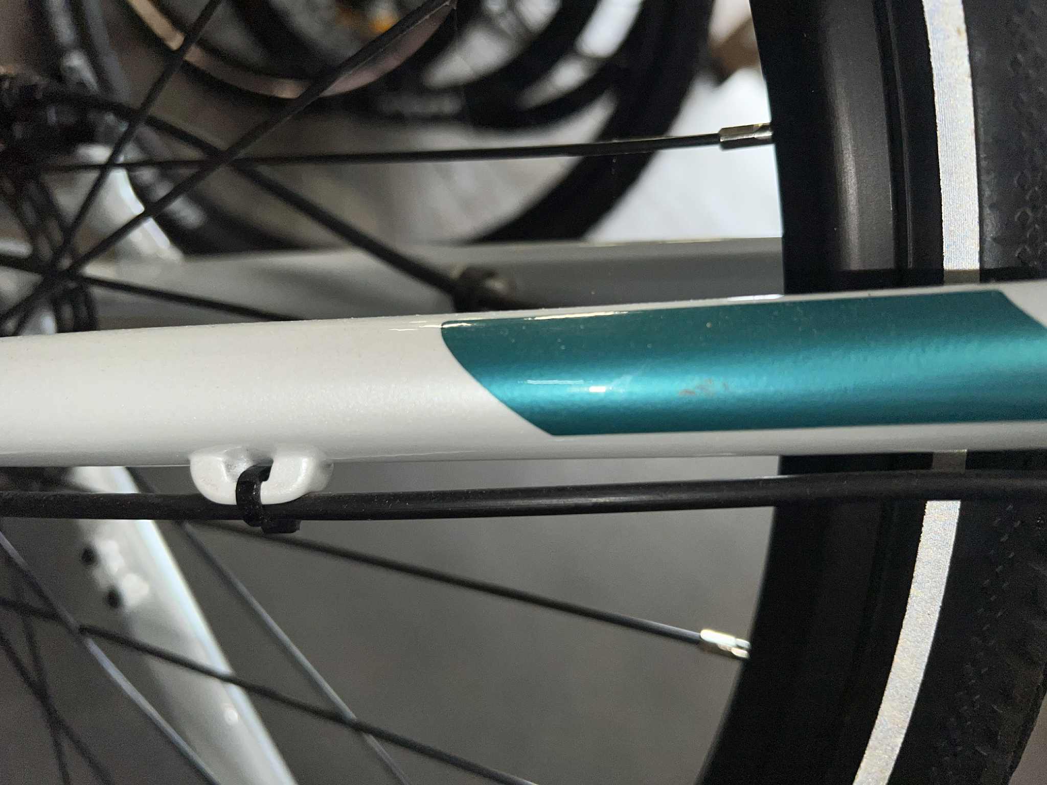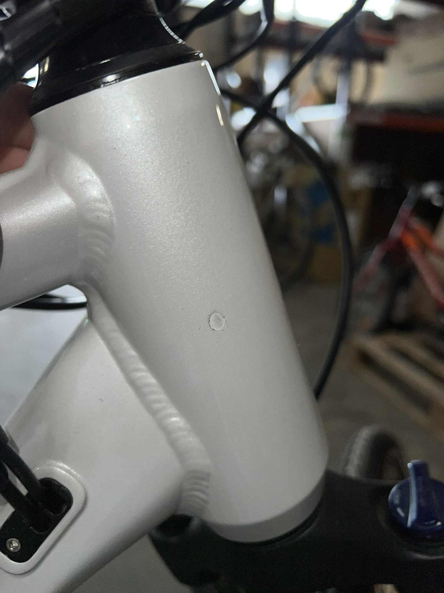 Rower Evado Hybrid 1.0 jest rowerem nowym nieużywanym, posiada odprysk lakierniczy na przodzie ramy ma również odrapaną prawą stronę amortyzatora.