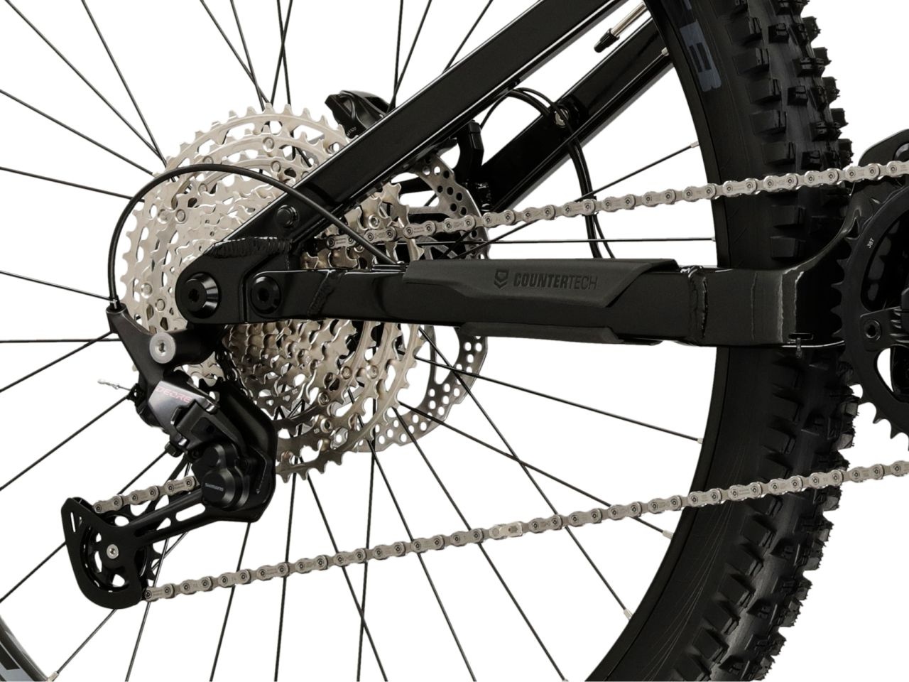 - Tylne koło 27.5 cala: Mniejsze i lżejsze koło jest bardziej zwinne i łatwiej nim manewrować. Umożliwia szybsze przyspieszanie i sprawia, że rower jest bardziej "chętny" do skręcania i zabawy. Dodatkowo, krótszy tył ramy (chainstay) poprawia zwinność i daje więcej przestrzeni dla ciała na stromych zjazdach.