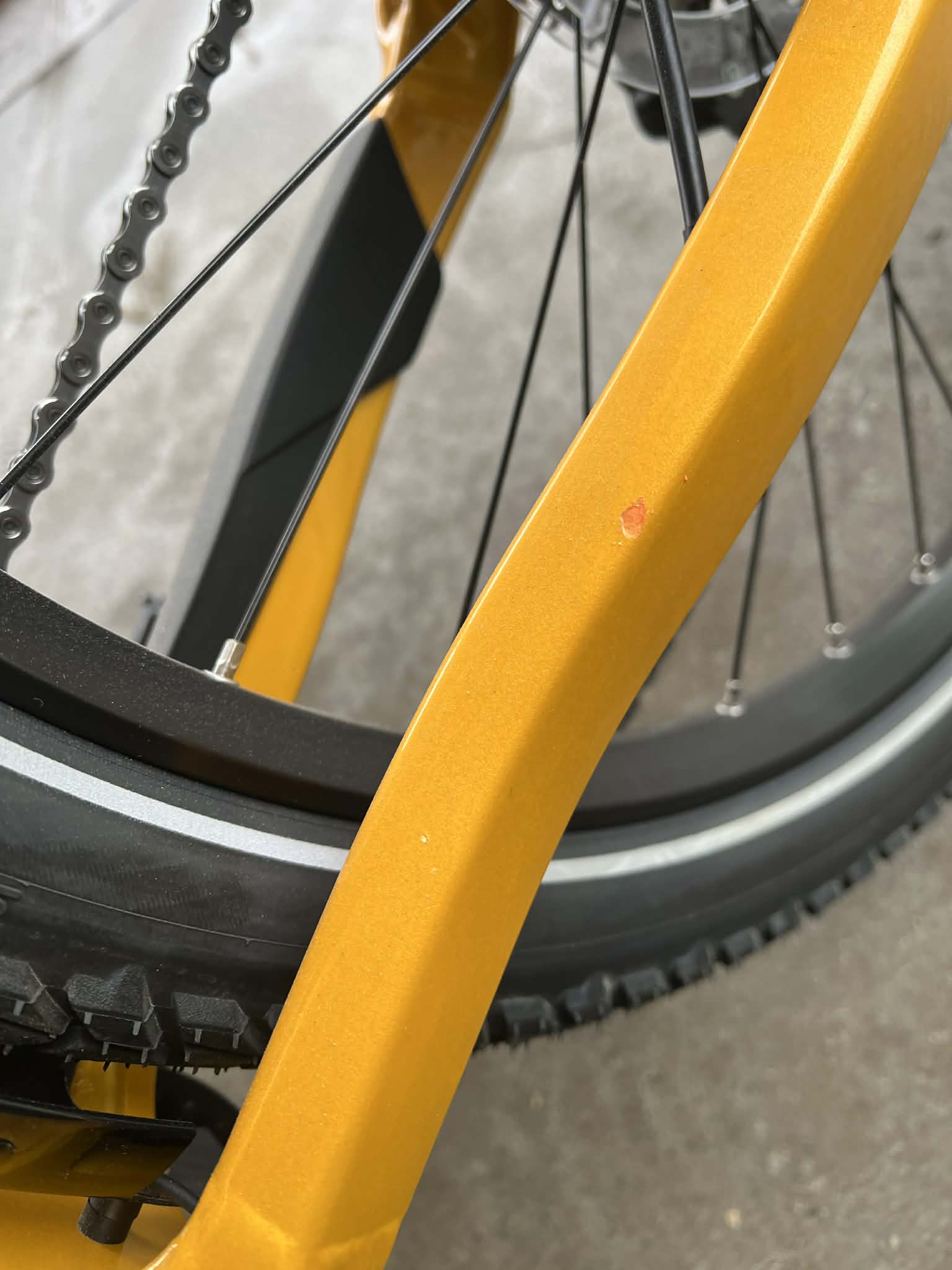 Rower posiada odprysk lakierniczy oraz drobne zarysowania w wyniku magazynowania, ma przejechane 1km.