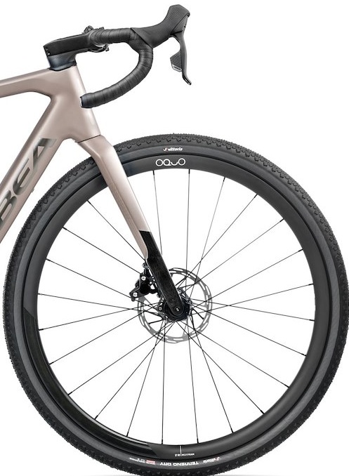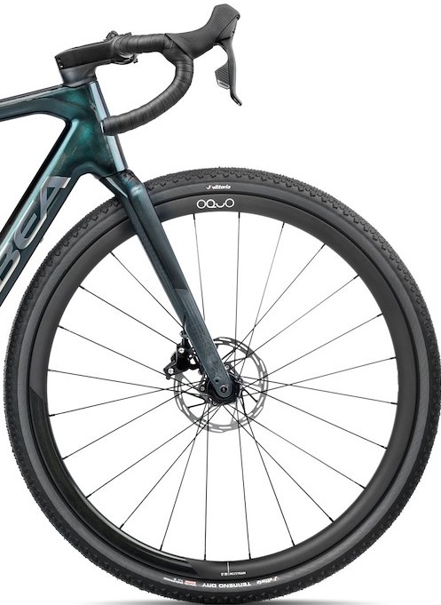 Rower toczy się na zestawie kół Oquo Road Control RC25TEAM. Oquo to marka komponentów należąca do Orbea, co gwarantuje idealną integrację z ramą. Model RC25TEAM to lekki i wytrzymały zestaw aluminiowy, przygotowany do montażu opon bezdętkowych (Tubeless Ready). Standard osi Thru Axle (12x100mm z przodu, 12x142mm z tyłu) znacząco zwiększa sztywność połączenia koła z ramą i widelcem, co przekłada się na lepszą precyzję prowadzenia.
