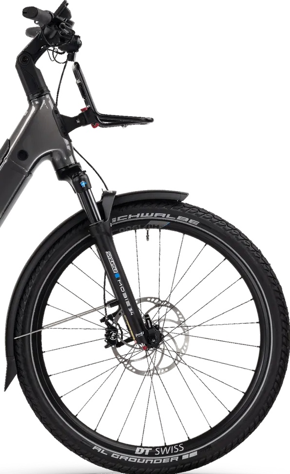 - Amortyzowany Widelec SR Suntour Mobie 34: Poprawia komfort i kontrolę na nierównych nawierzchniach, pomagając utrzymać kontakt opony z podłożem.
