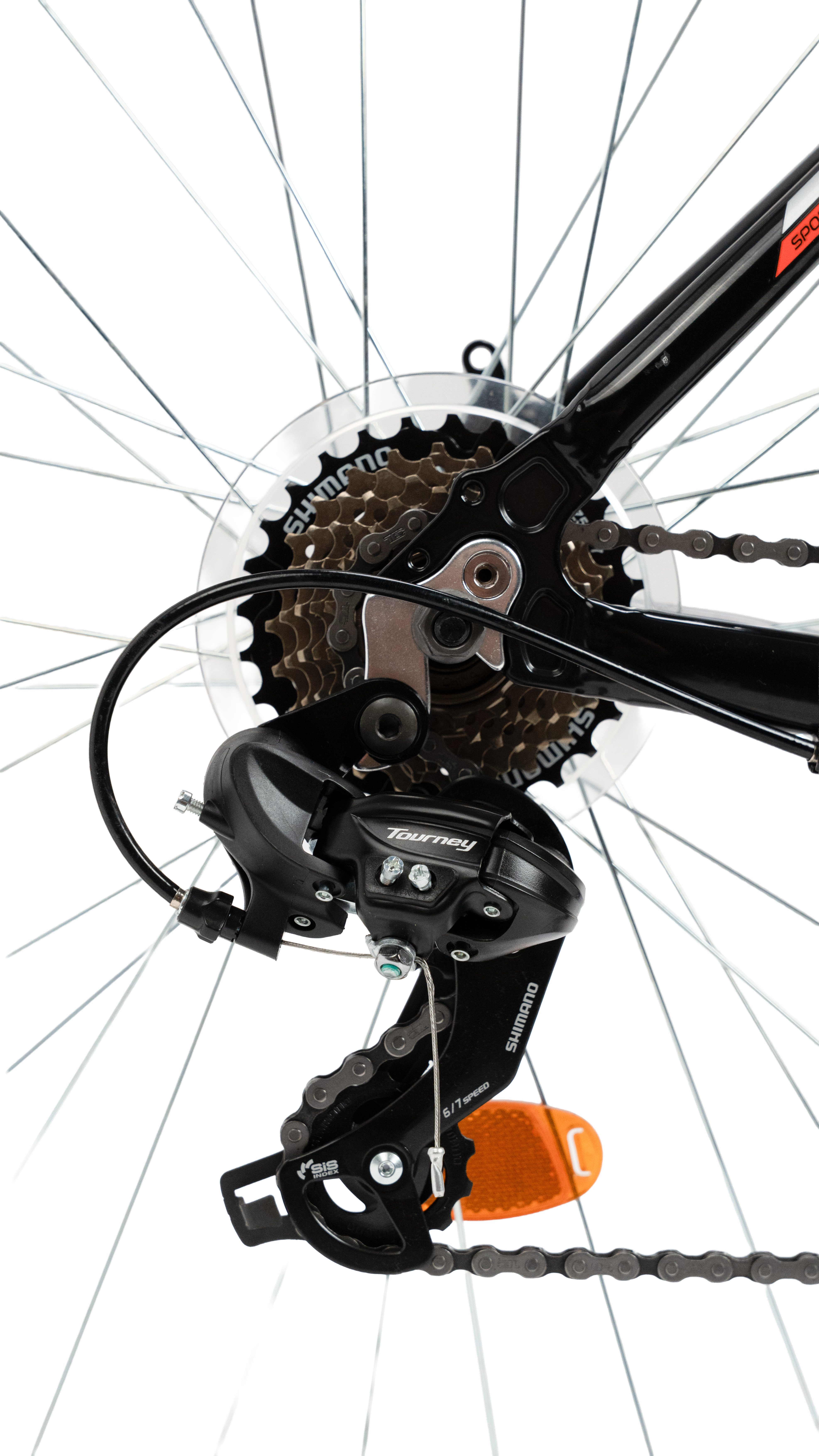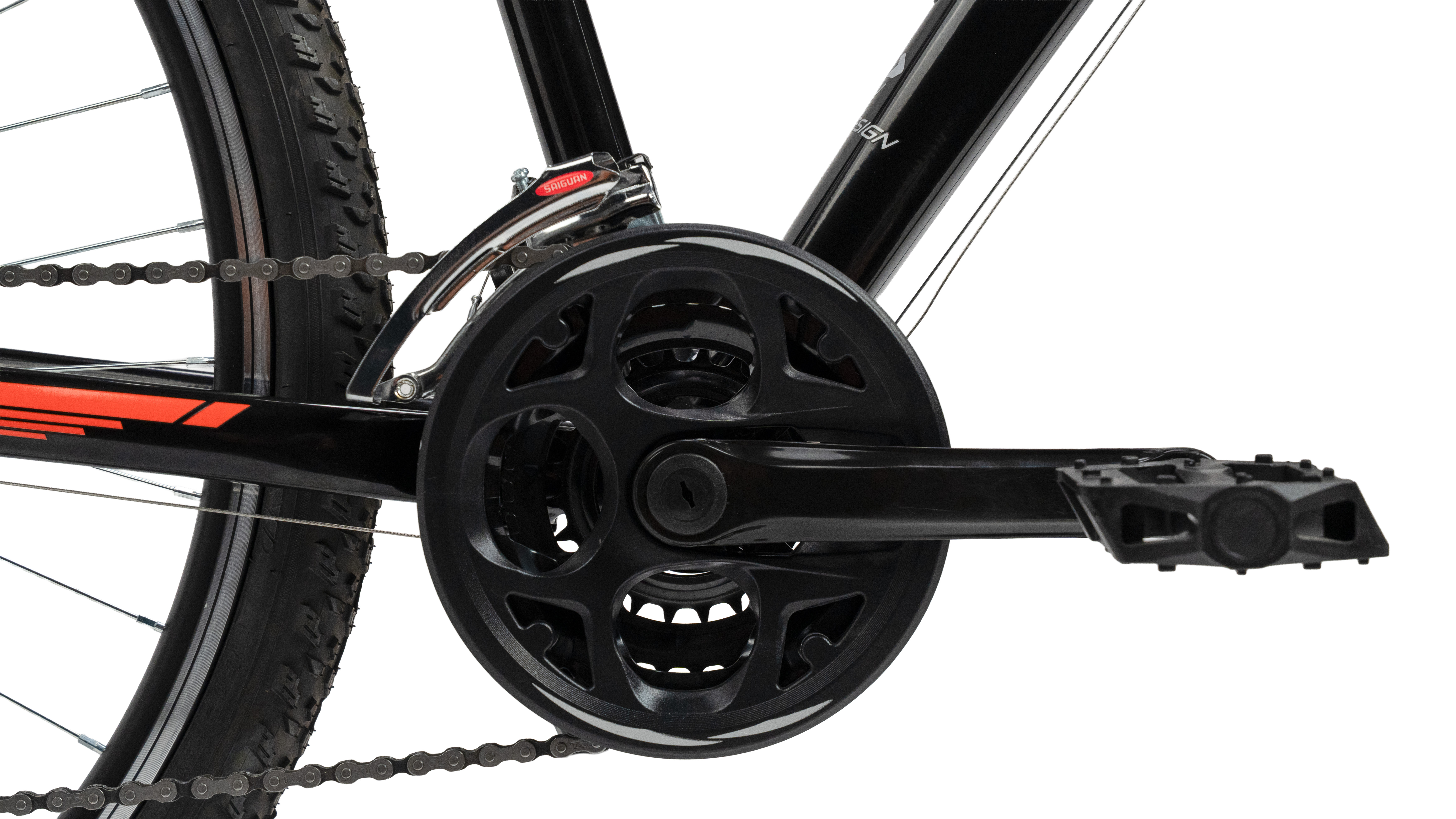 Napęd w układzie 3x7 (21 biegów) oparto na podstawowych, ale sprawdzonych komponentach. Za zmianę biegów odpowiadają klamkomanetki SHIMANO ST-EF51 oraz tylna przerzutka SHIMANO Tourney. Jest to prosty i funkcjonalny zestaw, który zapewnia wystarczający zakres biegów do pokonywania łagodnych wzniesień i komfortowej jazdy po płaskim terenie. Mechanizm korbowy posiada osłonę, która pomaga chronić odzież przed wkręceniem i zabrudzeniem.