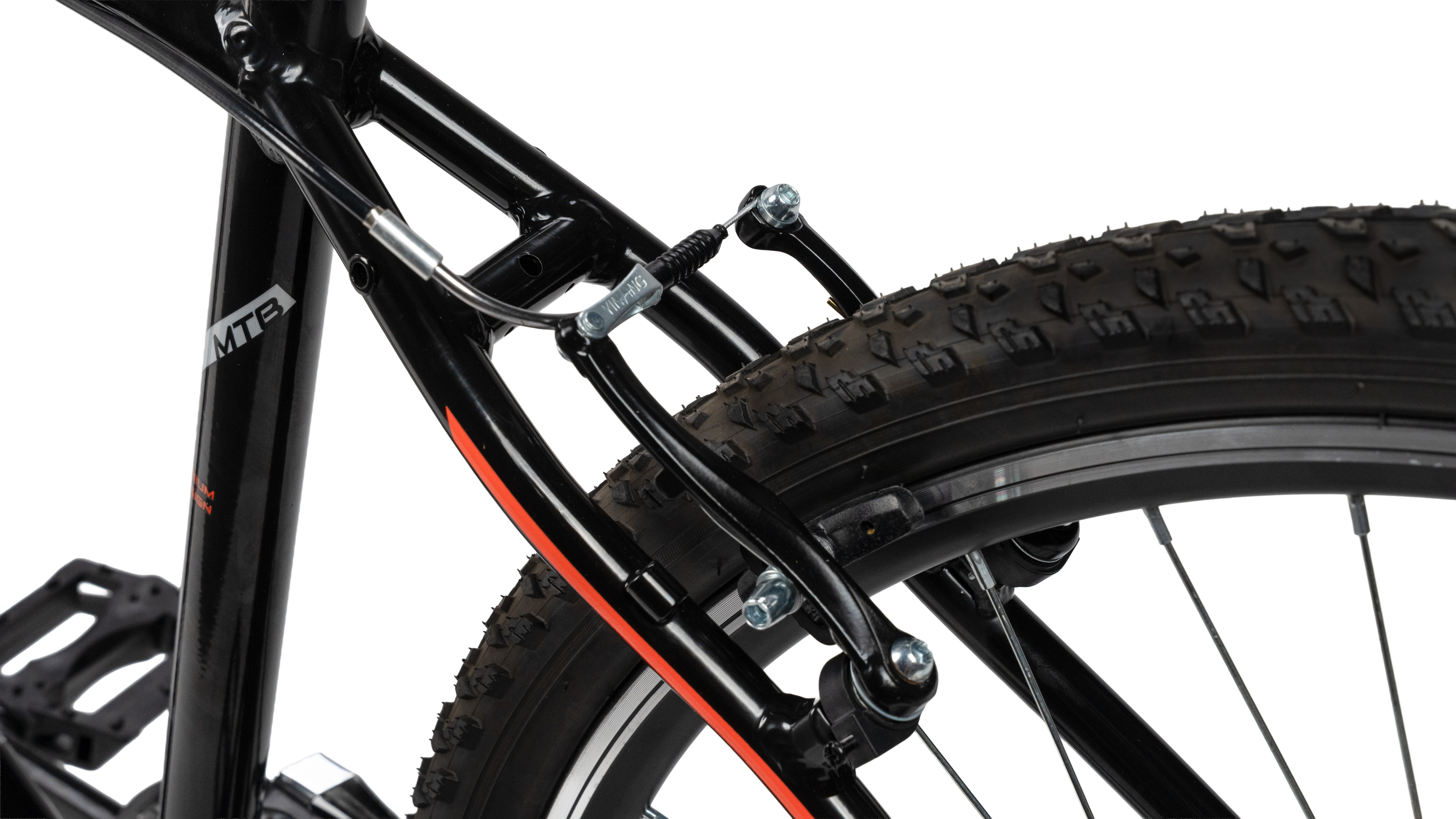 Bazą roweru jest aluminiowa rama MTB Line, która jest lżejsza od ram stalowych i odporna na rdzę. Posiada otwory montażowe, co pozwala na łatwe doposażenie roweru w błotniki czy bagażnik. Zastosowanie wymiennego haka przerzutki to praktyczne rozwiązanie, które w razie uszkodzenia chroni ramę przed drogą naprawą. Za tłumienie drgań odpowiada amortyzowany widelec ze skokiem 80 mm – jest to wartość wystarczająca do rekreacyjnej jazdy, która pomoże wytłumić część wstrząsów na nierównych drogach.