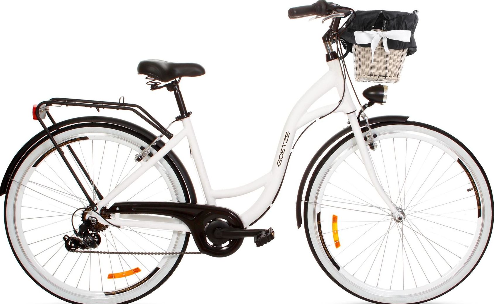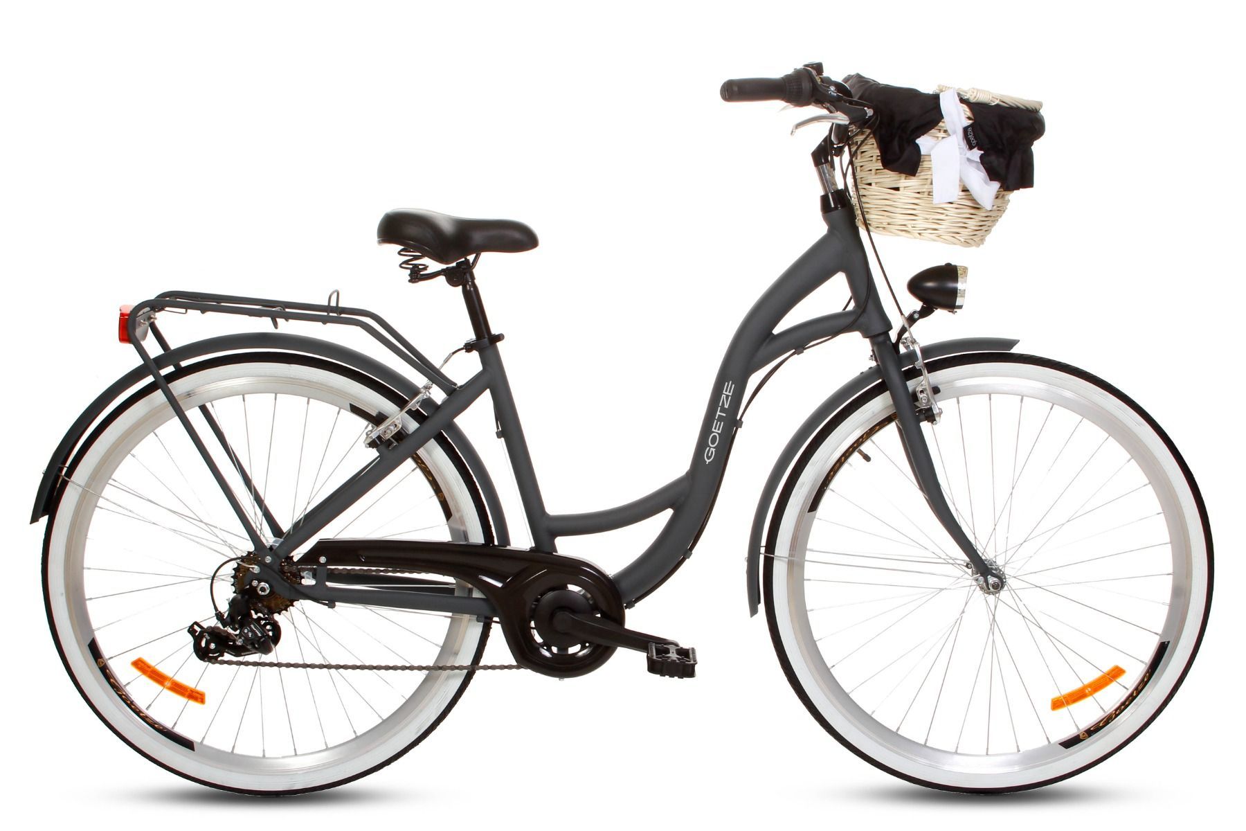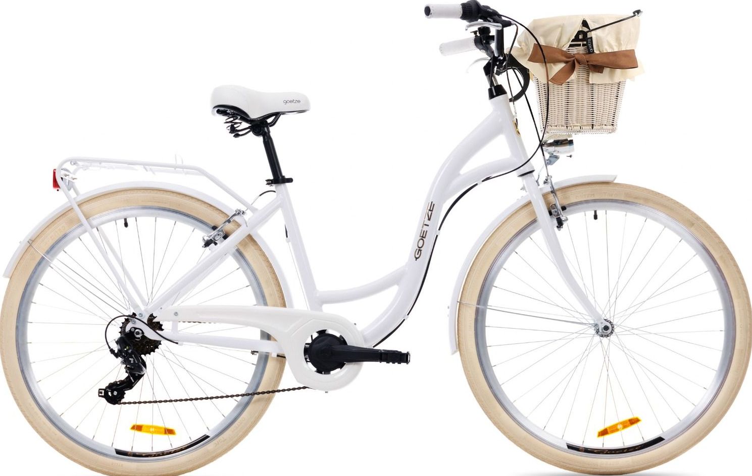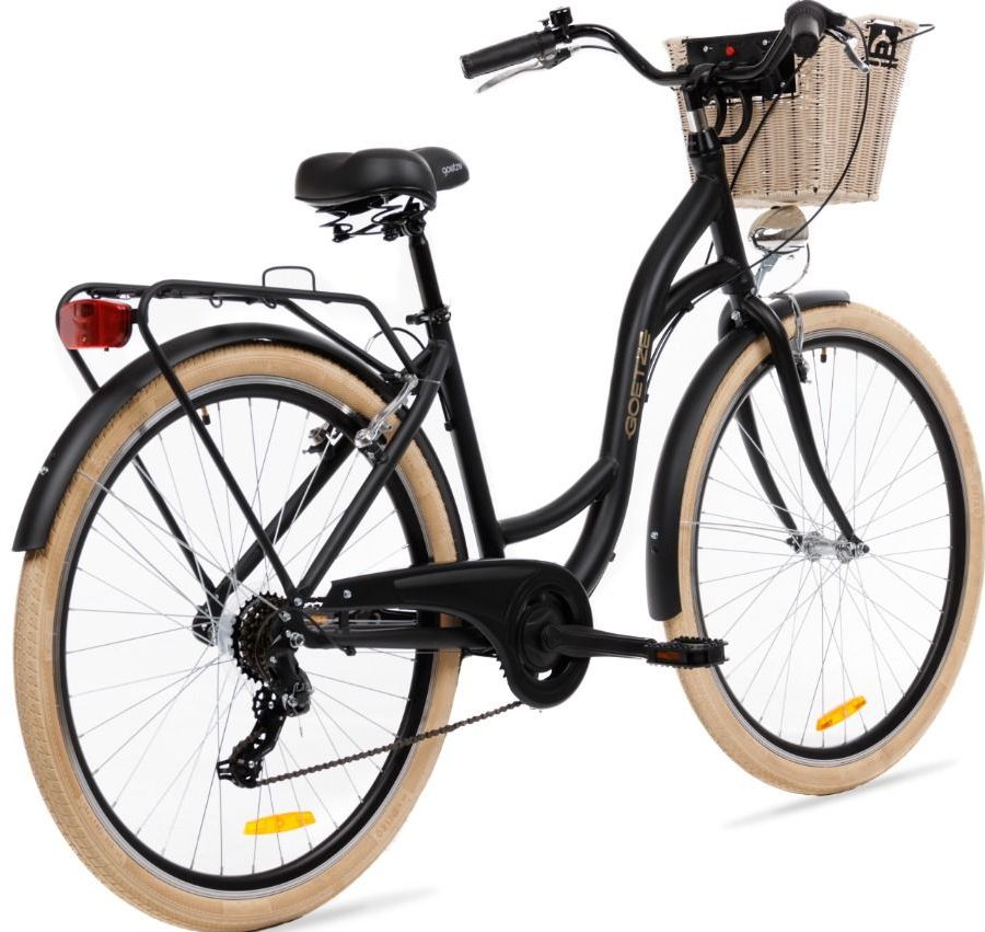 | Wyposażenie standardowe | Kosz na kierownicę z wkładem, wytrzymały bagażnik, błotniki, oświetlenie LED na baterie, składana podpórka, dzwonek. |