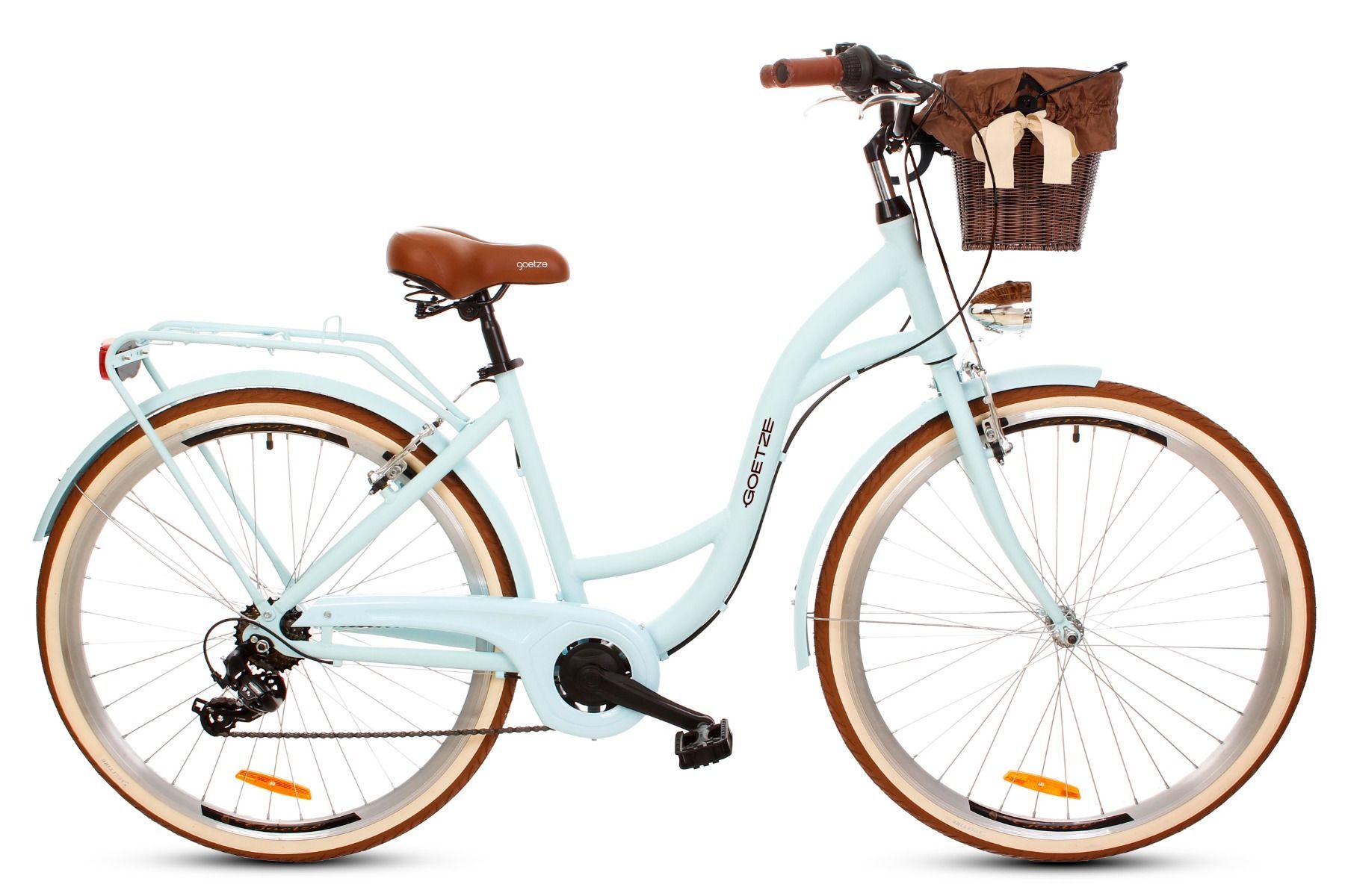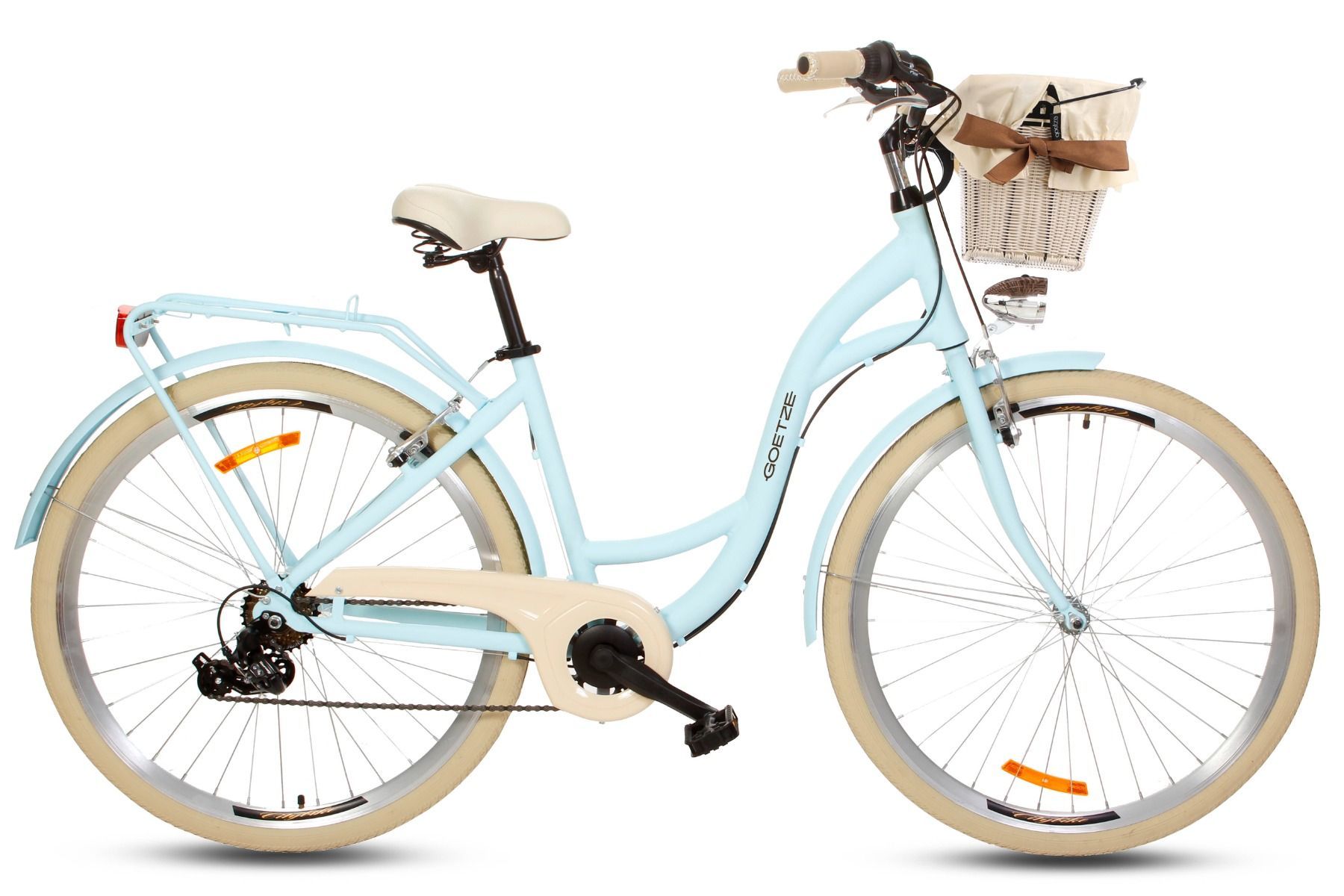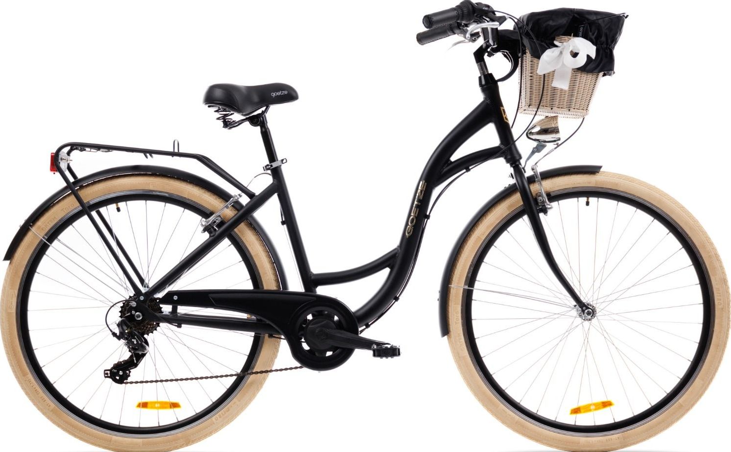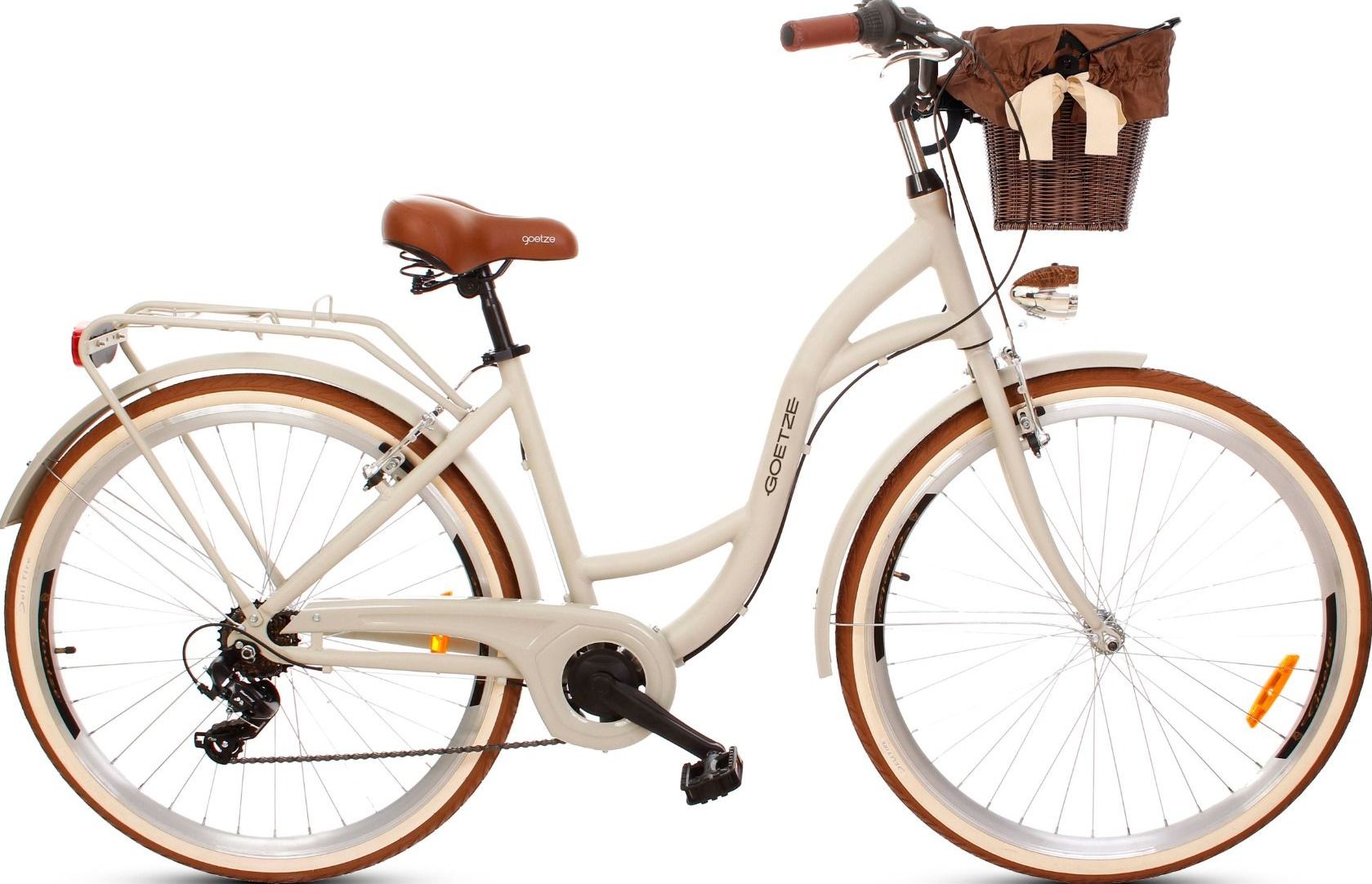 | Wyposażenie standardowe | Kosz na kierownicę z wkładem, wytrzymały bagażnik, błotniki, oświetlenie LED na baterie, składana podpórka, dzwonek. |