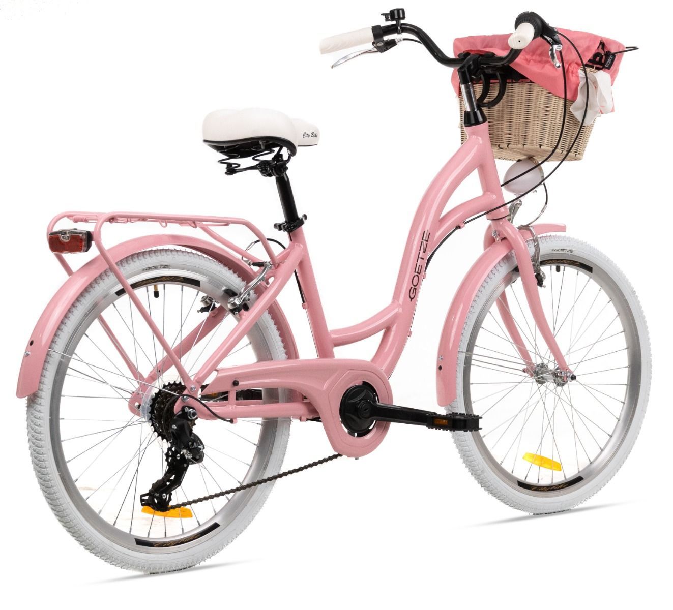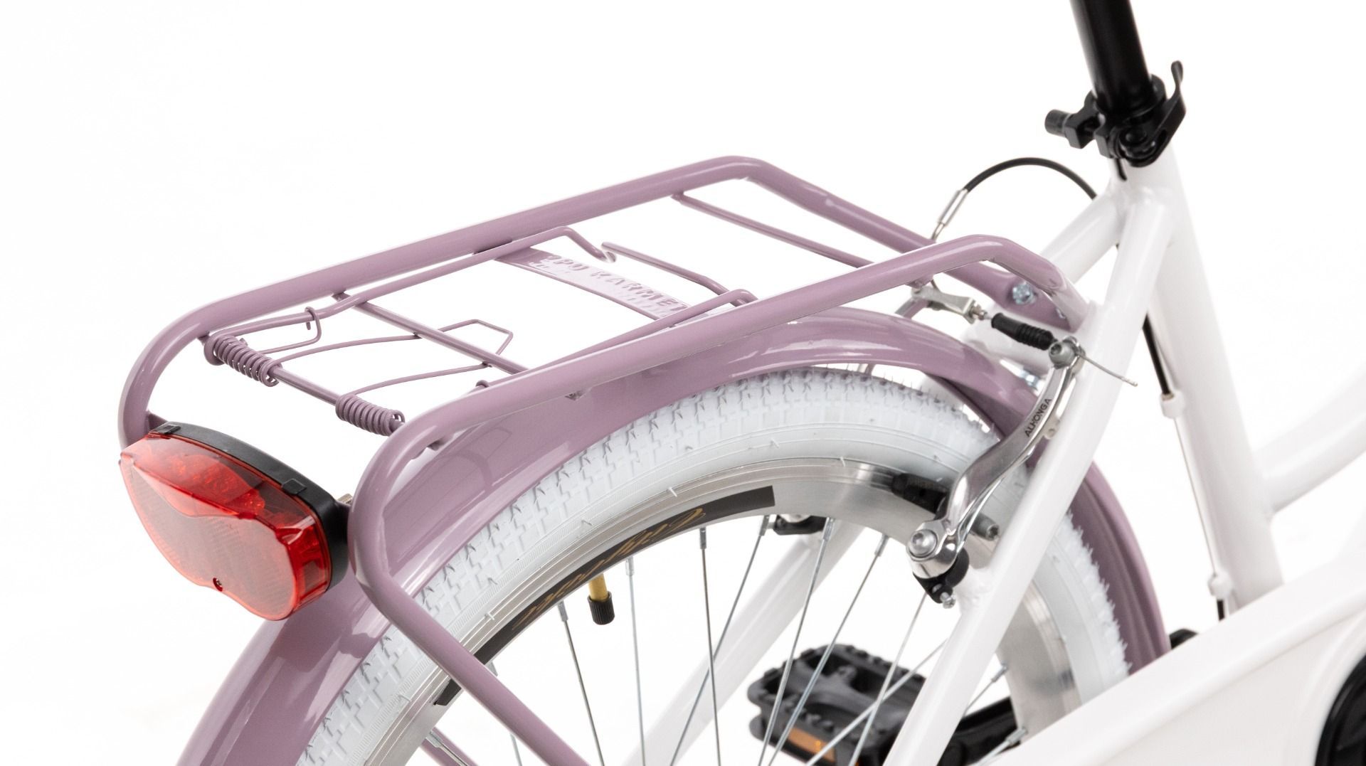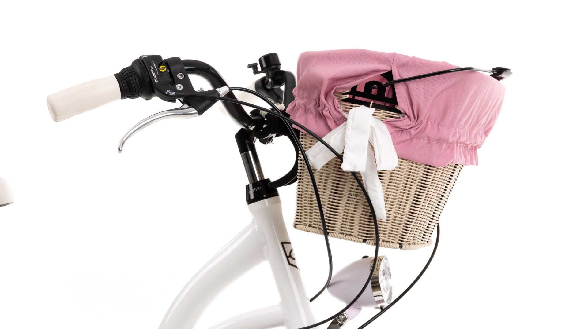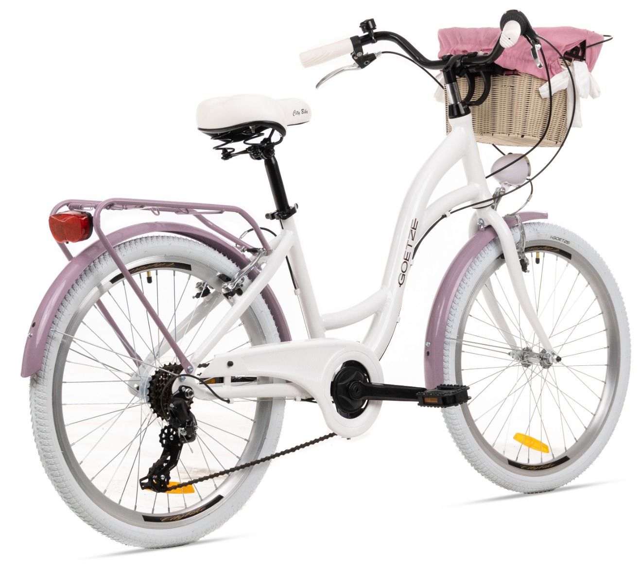 | Wyposażenie | Pełne błotniki, bagażnik ze sprężyną, osłona łańcucha, oświetlenie LED na baterie, podpórka, dzwonek, odblaski, kosz na kierownicę z wkładem |