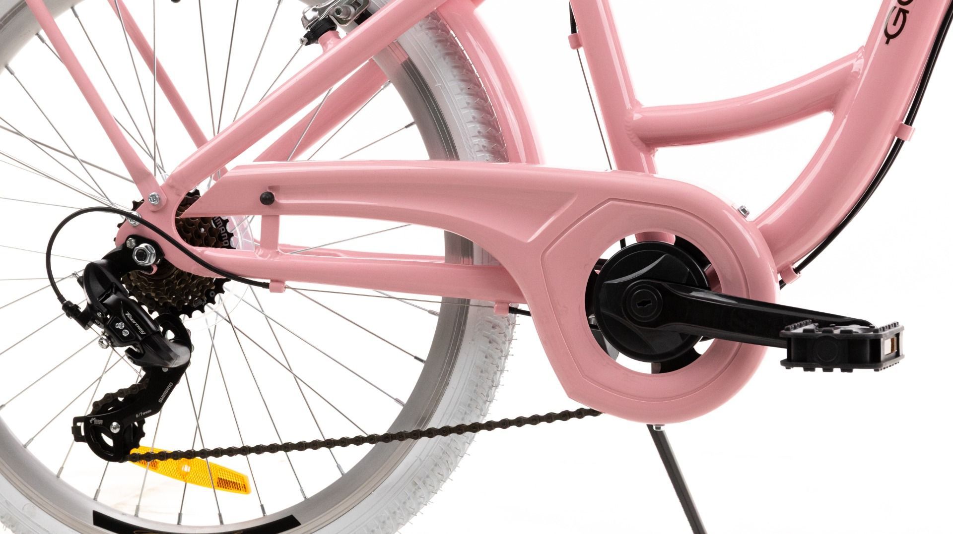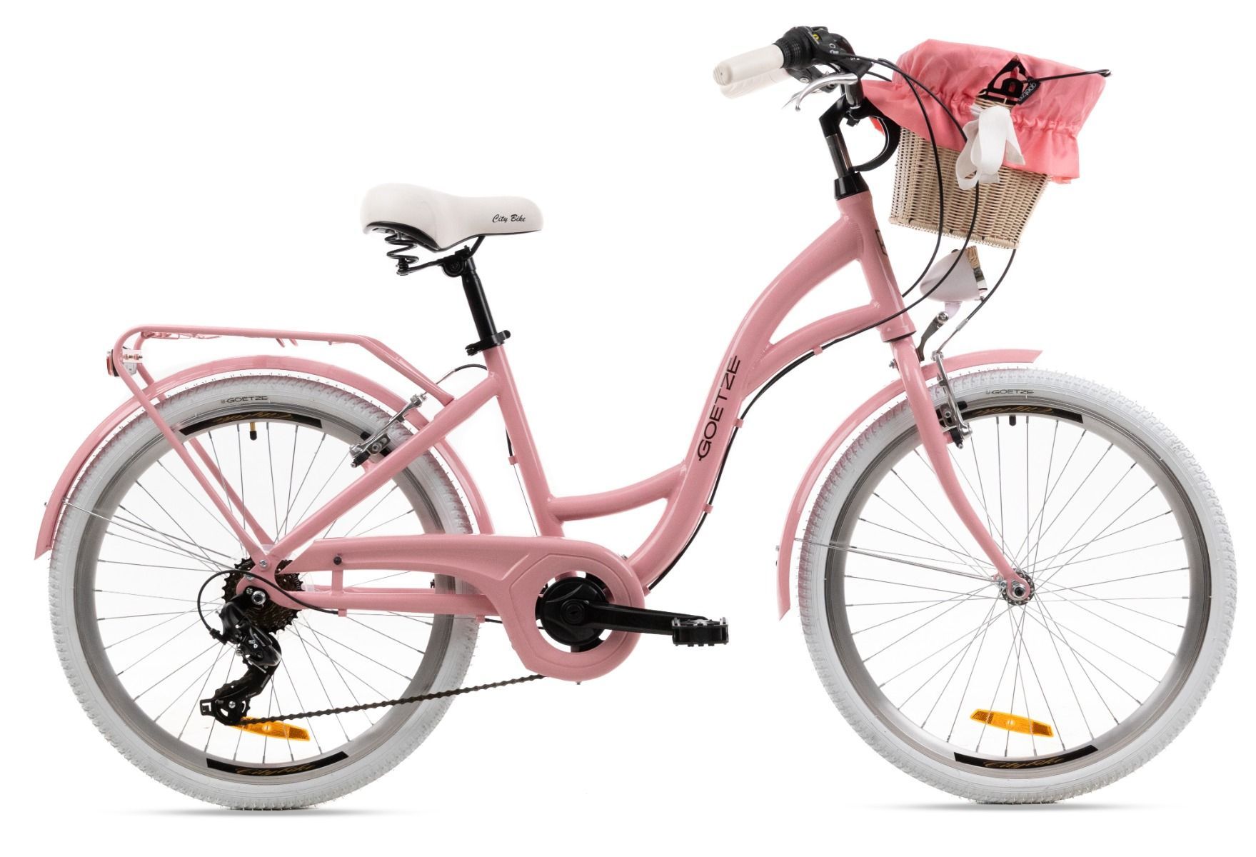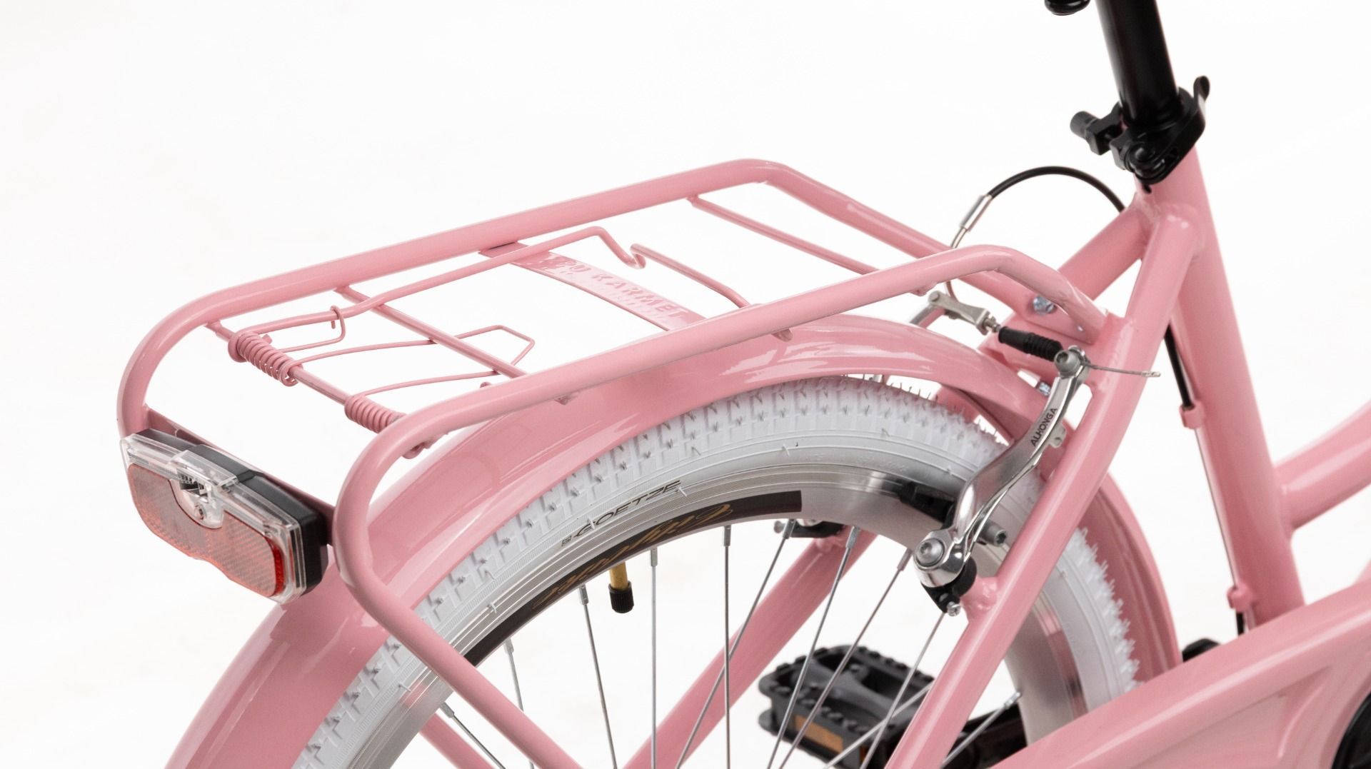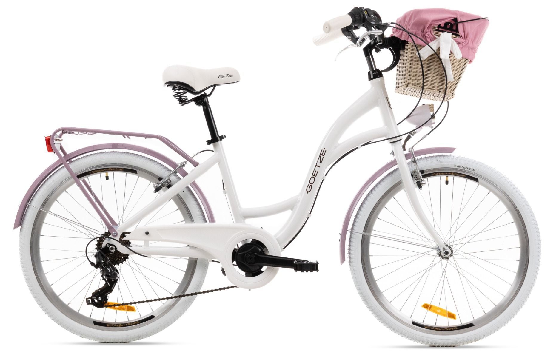 | Wyposażenie | Pełne błotniki, bagażnik ze sprężyną, osłona łańcucha, oświetlenie LED na baterie, podpórka, dzwonek, odblaski, kosz na kierownicę z wkładem |