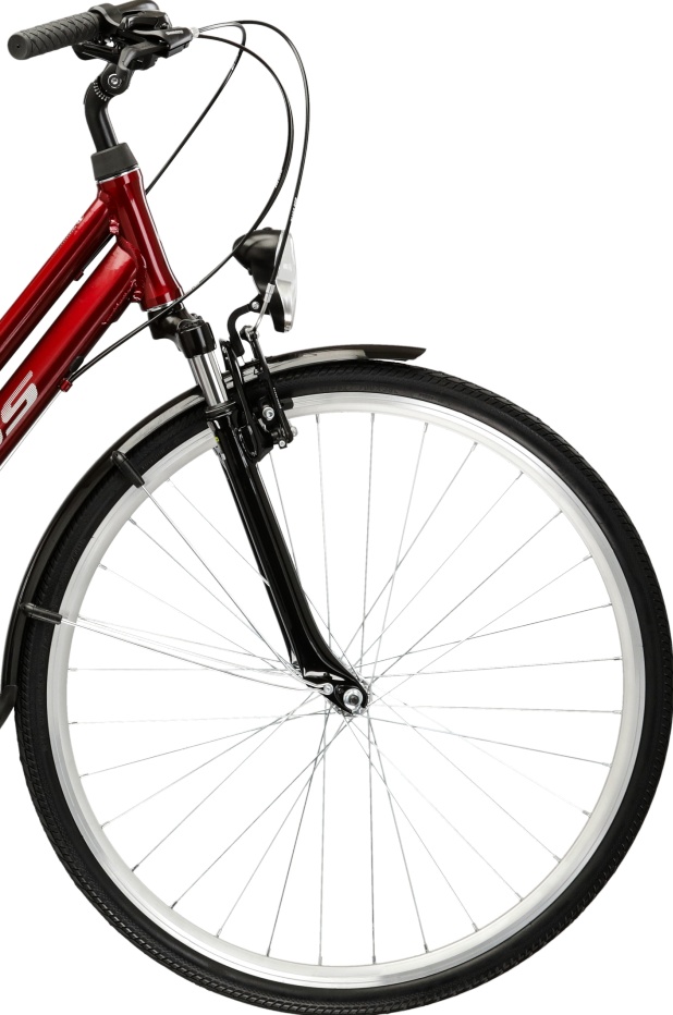 Lekka, aluminiowa rama została zaprojektowana specjalnie z myślą o kobiecej anatomii. Wyraźnie obniżona górna rura (tzw. damka) to ogromne ułatwienie – możesz swobodnie wsiadać i zsiadać z roweru w każdej sytuacji, nawet w spódnicy czy sukience. To dodaje pewności siebie na starcie i podczas postojów na światłach. Całość pokryta jest pięknym, lśniącym lakierem w kolorze rubinowym, który z pewnością przyciągnie spojrzenia.