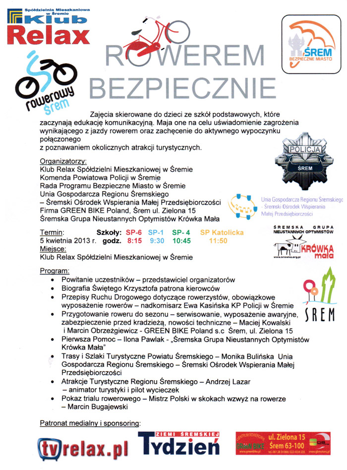 Zajęcia skierowane do dzieci ze szkół podstawowych, które zaczynają edukację komunikacyjną. Mają one na celu uświadomienie zagrożenia wynikającego z jazdy rowerem oraz zachęcenie do aktywnego wypoczynku połączonego z poznawaniem okolicznych atrakcji turystycznych.