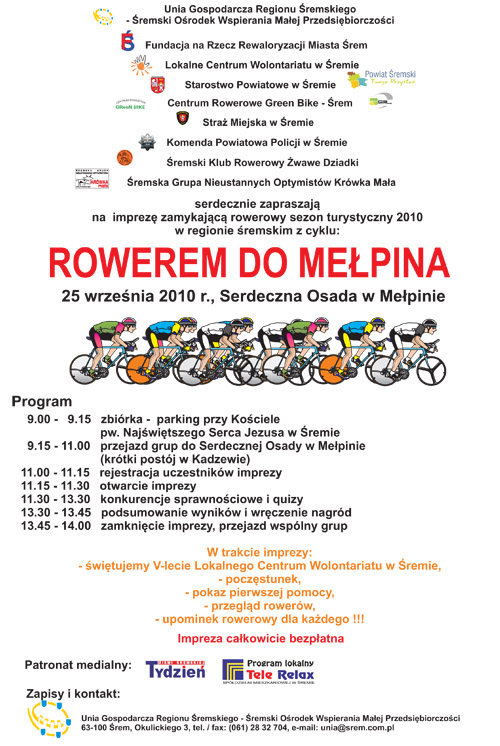 Dnia 25.09.2010r. zorganizowany został rajd z okazji zamknięcia sezonu rowerowego. Spod kościoła NSJ na Jezioranach pod eskordą Policji i Straży Miejskiej wyruszyliśmy do Mełpina. Na licznie zgromadzonych uczestników czekało wiele atrakcji. Serwis z Green Bike rozwiązywał techniczne problemy z rowerami rajdowiczów. Atrakcje: przeciąganie liny, slalom rowerowy, chodzenie na szczudłach, rzut w dal rzutką ratowniczą, ściana wspinaczkowa i wiele innych. Zabawa w Serdecznej Osadzie trwała do godziny 14:00 - później wróciliśmy rowerami do Śremu.