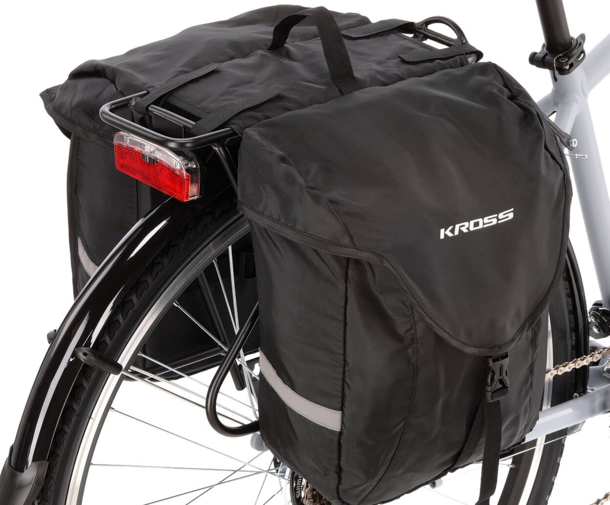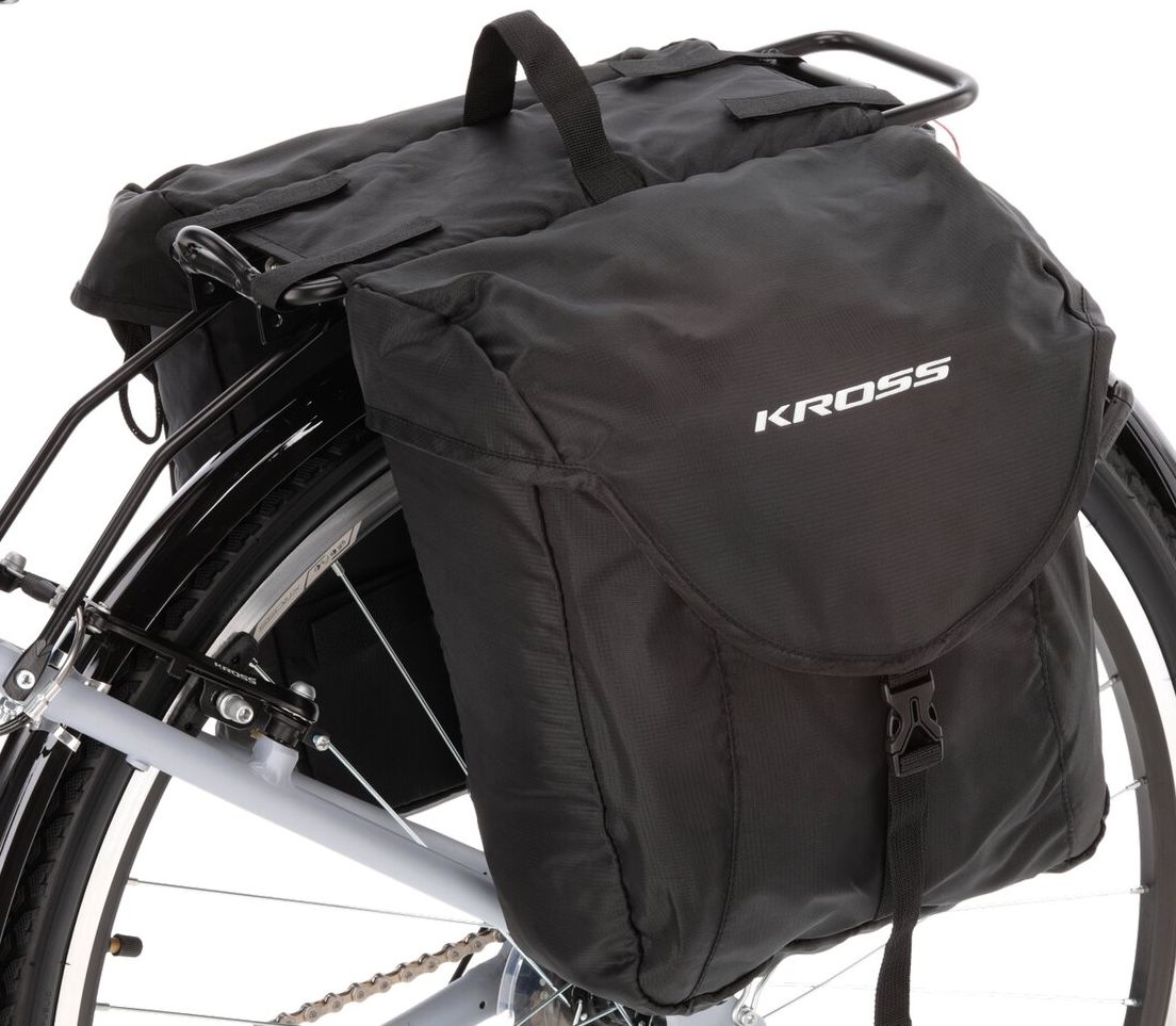 Torba Kross Roamer Rear Bag mocowana jest do bagażnika z tyłu roweru za pomocą bardzo mocnych i wytrzymałych rzepóœ. Montaż, a także demontaż jest prosty i intuicyjny, nie wymaga przy tym użycia żadnych specjalistycznych narzędzi. Spód torby otoczony jest regulowanym paskiem, co ułatwia pakowanie i przewożenie rzeczy, a także dostosowywanie ilości miejsca do własnych potrzeb. Na górze torba posiada również uchwyt ułatwiający transport oraz montaż.