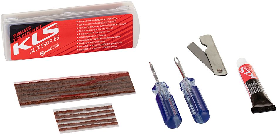 Zestaw przeznaczony do naprawy opon bezdętkowych. Nadaje się do otworów w oponach MTB i szosowych bezdętkowych, które nie są odpowiednio uszczelnione uszczelniaczem. Zawiera narzędzie do wkrętów i kołków, które ułatwiają nakładanie kołków naprawczych oraz nóż do łatwego usuwania nadmiaru materiału.